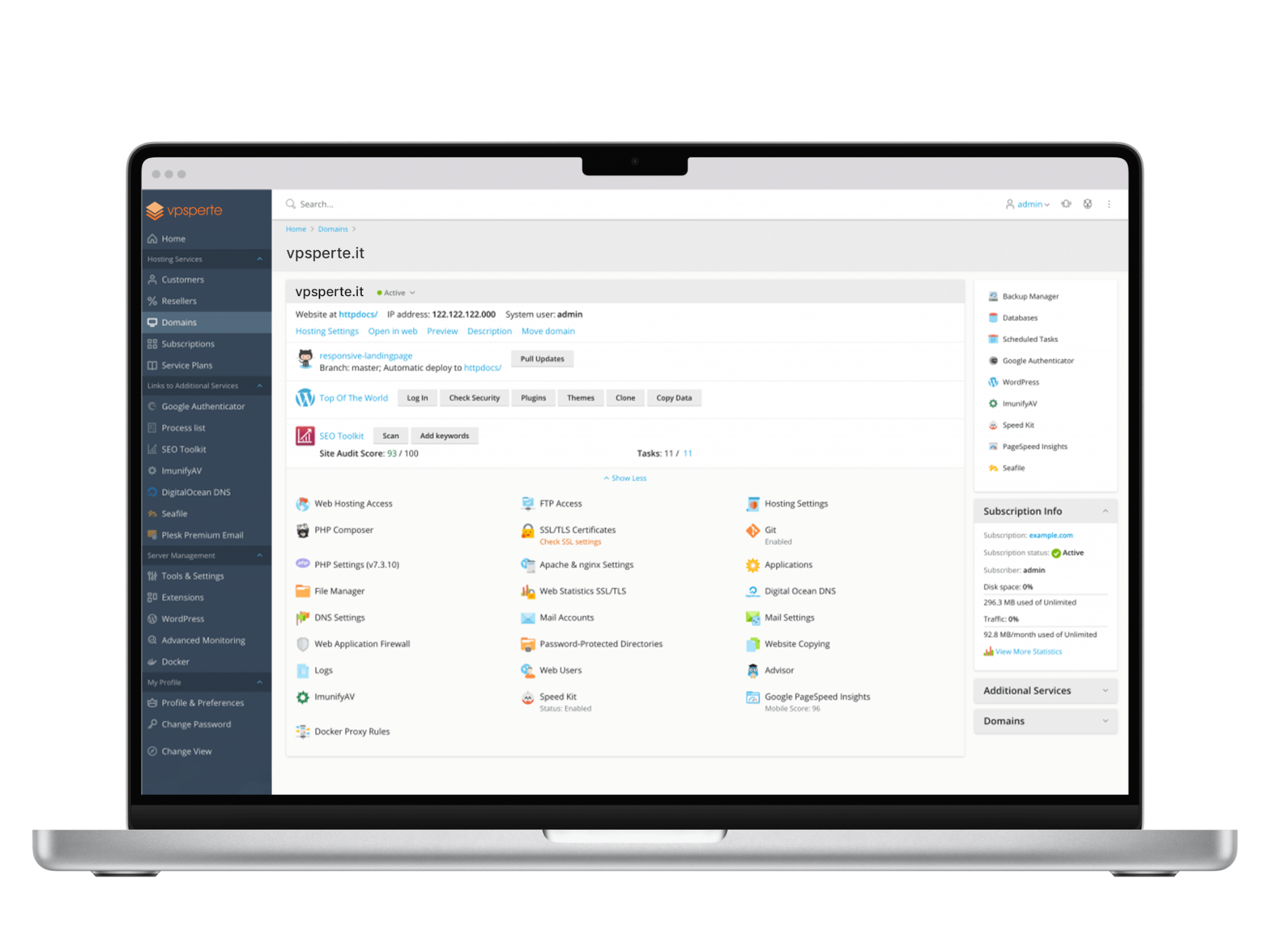 Scopri di piùOffriamo la gestione dei nostri VPS tramite Plesk, uno dei migliori pannelli di controllo sul mercato. Grazie a questo strumento, potrai amministrare il tuo server in modo semplice e intuitivo, accedendo a tutte le funzionalità necessarie per creare e gestire siti web, database, e-mail e molto altro. Plesk è progettato per semplificare ogni aspetto della gestione del server, rendendolo ideale sia per principianti che per esperti.